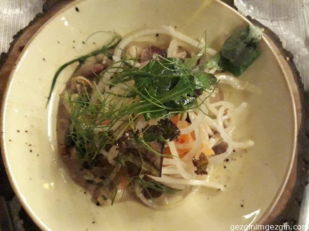 İkinci yemeğimiz yöreye özgü piyaz. Ama bu piyaz farklı bir piyaz. 3-4 çeşit fasülyeden yapılmış. Zencefil, çifte kavrulmuş tahin, somon, kırmızı soğan, turp var. Turp ve soğan aromalarını hissetmek imkansız sanki. Geleneksel piyazda alışkın olduğumuz sirkeli-limonlu asidite yerini kavrulmuş tahinli sosa bırakmış. Likya Vineyards Füme Blanc 2018 ile eşleştirilmiş.