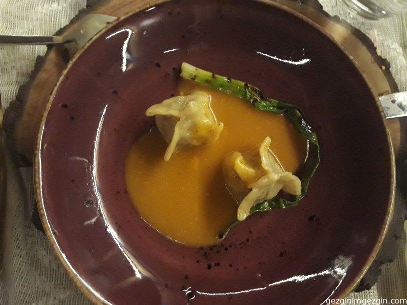 Üçüncü yemeğimiz ördek etli mantı, tarhana, çörek otu, pırasa. Bana tuz oranı fazla geldi. Likya Arkeo Merzifon Karası 2018 ile eşleştirilmiş. Burun kiraz, erik, kırmızı meyveler olan, iyi bir asiditeye sahip, orta gövdeli bu şarabı yemek bana tuzlu geldiği için bağımsız içmeyi tercih ettim. Ayrıca ördek etini de biraz sert buldum.