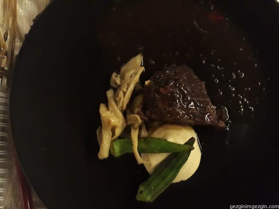 Dördüncü yemeğimiz pastırma dana yanak, çemen, kereviz kreması,mantar, bamya salatası. Pastırmalaştırılmış dana yanağının tuzluluğu,kereviz kreması ile giderilmeye çalışılmış. Dana yanağı Sous Vide tekniği ile 70 saat pişmiş. Yemeğe eşlikçi olarak Likya Vineyars Malbec 2018 seçilmiş. Çok da iyi olmuş.