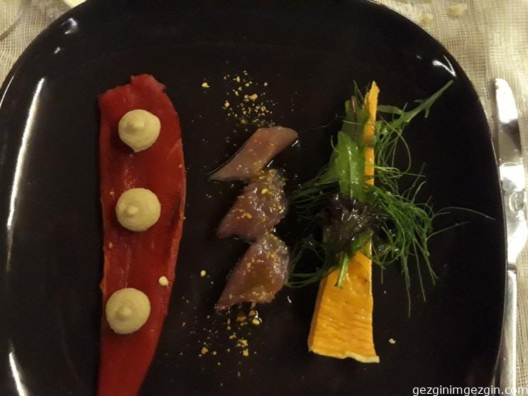 İlk yemeğimiz lakerda palamut, elma çayı, köz biber,Ege otlu humus, kabak tartı. Bu yemek Arykanda Chardonnay 2018 ile eşleştirilmiş. lakerda sık karşılaştığımız tuz oranı fazla lakerdalardan değil, yağlımsı lakerda, kabak tart ve humusun dokusu ile Chardonnay’ın Kremamsılığı iyi uymuş. Arykanda Chardonnay 2018 mineral notalarda taşıyor.