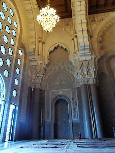 Caminin içi de ince ince işlenmiş taş oymacılığıyla insanı büyülüyor. İçerideki muhtelif mukarnas bezemeleri uzun uzun seyredilecek güzellikte. Ve en önemlisi Caminin tepesi de kısmen açılabilir olduğundan havalandırması gayet iyi; Buranın Fas’ta gayri müslümlerin girebildiği tek cami olduğu yazılı ama ben gittiğimde cübbeli, sarıklı, ak sakallı bir adam asasını yere vura vura Müslüman mısın?, diye sorguya çekti beni. Sorgu sual kısmından sonra içeri alındım. Belli ki rehberli turlar dışında içeri Müslüman olmayanları almıyorlar ya da o an bana ‘göründüler’ ama ben içeri girme telaşında, anlayamadım olayı.