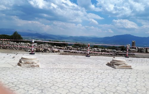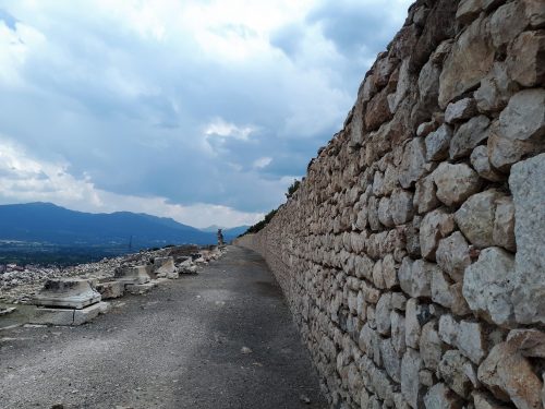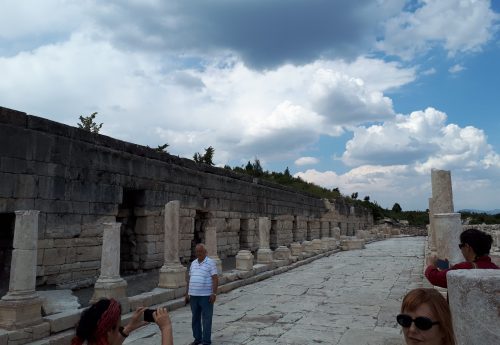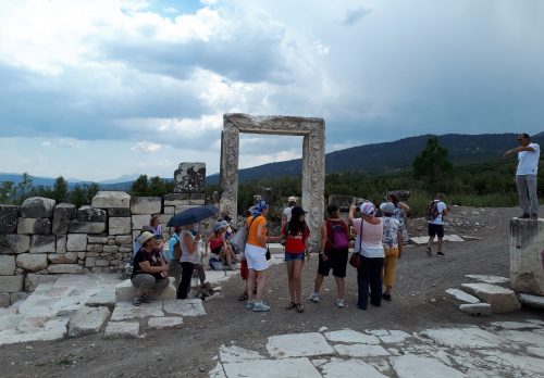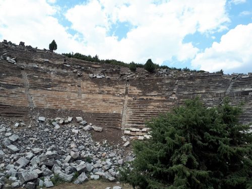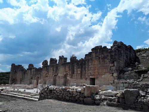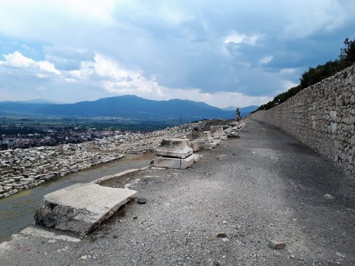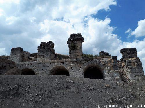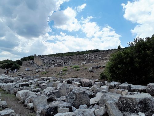 Hafif eğimli tepeye tırmandıkça, bazilika, agora, hamam, tiyatro, meclis binası, mezar, yuvarlak kuleli tak ve su yollarının kalıntılarını görebiliyorsunuz.