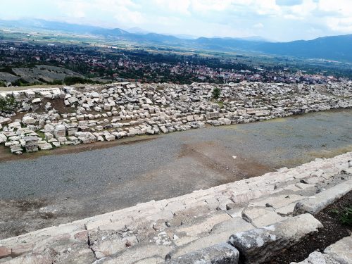 Hafif eğimli tepeye tırmandıkça, bazilika, agora, hamam, tiyatro, meclis binası, mezar, yuvarlak kuleli tak ve su yollarının kalıntılarını görebiliyorsunuz.