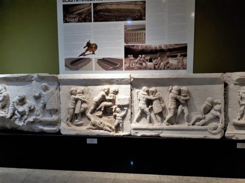 “Gladyatörler Kibyra’da” başlığı altında sergilenen duvar resimlerinde ve kabartmalarında, antik dönemin gladyatör gösterileri canlandırılmış. Bu gladyatörlerin çoğunluğu, kanun kaçaklarından, savaş esirlerinden, kölelerden oluşmaktaymış. Asillerin ve halkın, bu ölümüne yapılan gösterileri hangi duygular ile izlediklerini anlamak çok zor.