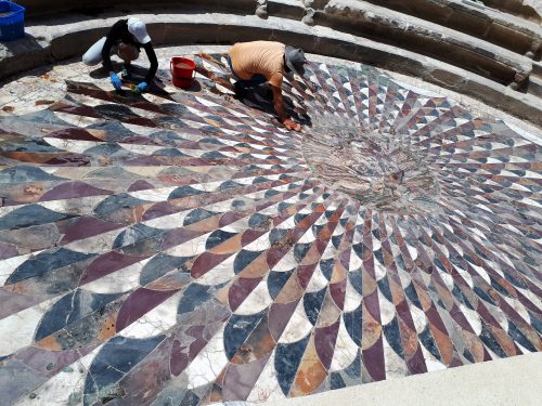 Mozaik üzerinde dikkatle çalışan görevliler vardı ve üzerine basılması yasaktı. Temizliği bitirildikten sonra cam yüzey korumasına alınacakmış.