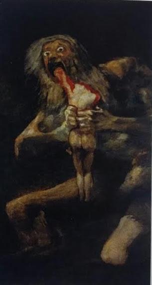 Goya’nın iktidar hırsının, insanı (çocuklarını bile yok edecek ölçüde) nasıl vahşileştirebildiğini anlatan, karanlık dönem resimlerinden “Oğlunu Yiyen Satürn 1819-1823” tablosu, konusunu Yunan mitolojisinden alıyor. Yunan tanrısı Kronoss/Satürn kendi yerine geçeceği kaygısıyla beş oğlunu doğar doğmaz yer. Karısı Ops, altıncı oğulları Zeus/Jüpiter’i Girit’de saklar. Sonunda Satürn’ün kehaneti doğru çıkar ve Jüpiter babasının yerine geçer.