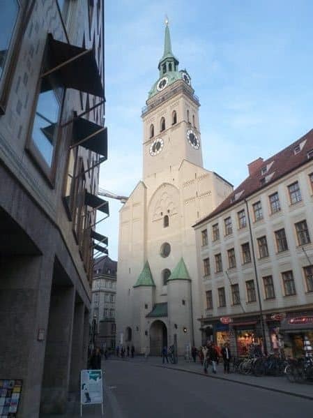 Marienplatz’da Rindermarkt tarafında yer alan Peterskirche, Neues Rathaus’un karşısında, biraz aşağısında kalıyor. Merkezdeki en eski kiliselerden, 11.yüzyılda yapılan ilk kilise zaman içinde değiştirilip genişletilmiş. Münih’teki ilk manastır yerleşkesi olarak da biliniyor. 18 yüzyıldan kalma altarı ve tavandaki freskolar göz alıcı. Kilisenin ‘Alter Peter’diye bilinen kulesinin sadece 2 tarafında saat var, bu kuleye 299 basamakla çıkılabiliyor. Çıkabilirseniz Münih’in kalbi olan bölgenin en güzel manzarasını görebilirsiniz. Yalnız kulenin tepesine çıkmak için 299 basamak yanında 3 Euro da ödemek gerekiyor. Kule, sabah haftaiçi 9, haftasonu 10’da açılıyor, akşam ise kışın 17.30, yazın 18.30 da kapanıyor.