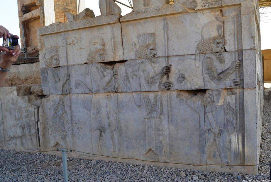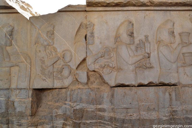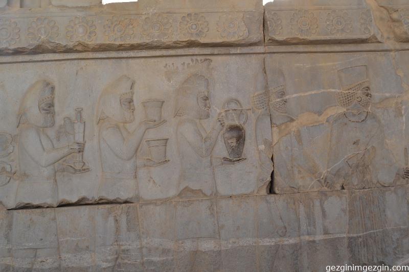 Apadana Tören Salonu’nun doğuya bakan basamaklarında, Hindistan’dan Afrika’ya 23 heyetten temsilcinin Pers kralına armağanlar verip sadakatlerini sunarken resmeden kabartmalar bulunmaktaymış. İmparatorlukta yaşayan bütün milletlerin birbirinden farklı giyimleri, saç stilleri ve kültürleri bu tören sırasında bir arada görülebiliyormuş. Ülkelerin elçileri bir selvi ağacı (hayat ağacı) ile diğer ülkelerin elçilerinden ayrılmış.