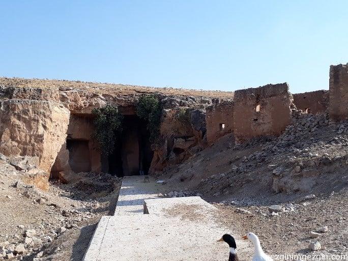 Daha sonra bir Sin tapınağı olan Pognon Mağarası’na gidiyoruz. Henri Pognon 1900’lü yılların başında Bağdat Konsolosu olan, yöreyi iyi bilen ve araştıran birisi. Höyüğün üzerindeki kaleyi fotoğraflayan, mağarayı bilim dünyasına ilk tanıtan kişi olduğu için mağara onun adıyla anılıyor. Mağaranın duvarlarındaki nişlerde kişilere ait kabartmalar ve süryanice yazılar var.