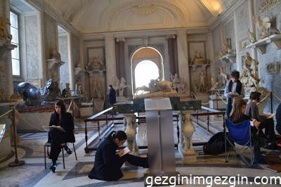 Müzenin kapısında rezervasyonumuz olduğundan beklemeden biletlerimizi alarak içeri girdik. Vatikan Müzeleri uzun, ters U şeklinde bir koridor şeklinde tasarlanmış. Soldan yürümeye başladık ve yolun en sonunda Sistina Şapeli’ne ulaştıktan sonra geriye dönüp tur tamamlanıyor.
